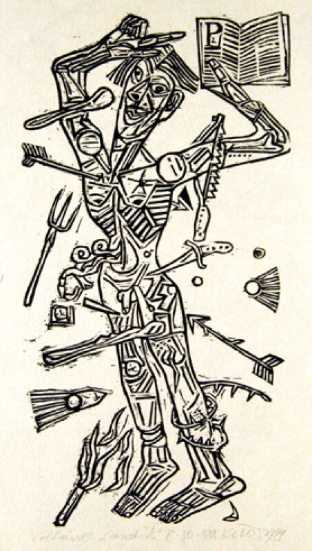Rolf Kuhrt (1936 ) Voltaire "Candide" (1999) Holzschnitt in Schwarz auf Bütten Abmessungen in cm: 31.5/16.5/0 (H/B/T) Preis: 80,00 €