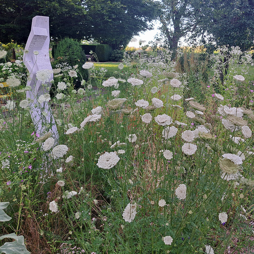 Unser Skulpturengarten bietet in diesem Sommer einen besonderen Anblick. Die vielen Regengüsse begünstigten das Wachstum von Wiesenpflanzen, die sonst im Sommer wegen Trockenheit kaum in Erscheinung treten. Deshalb haben wir an einzelnen Stellen Wiesenfelder nicht gemäht und es stehen nun in ungewöhnlicher Dichte Pflanzen wie die wilde Möhre, amerikanisches Berufskraut, Königskerzen, Sauerampfer, wilder Majoran etc..