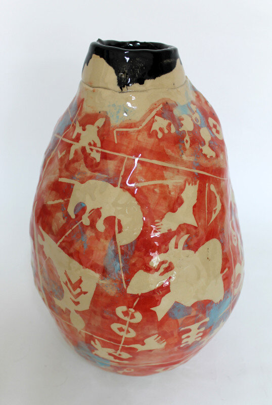 - Technik: Keramik: aufgebaut, Engobe- Reservage-Technik, glasiert